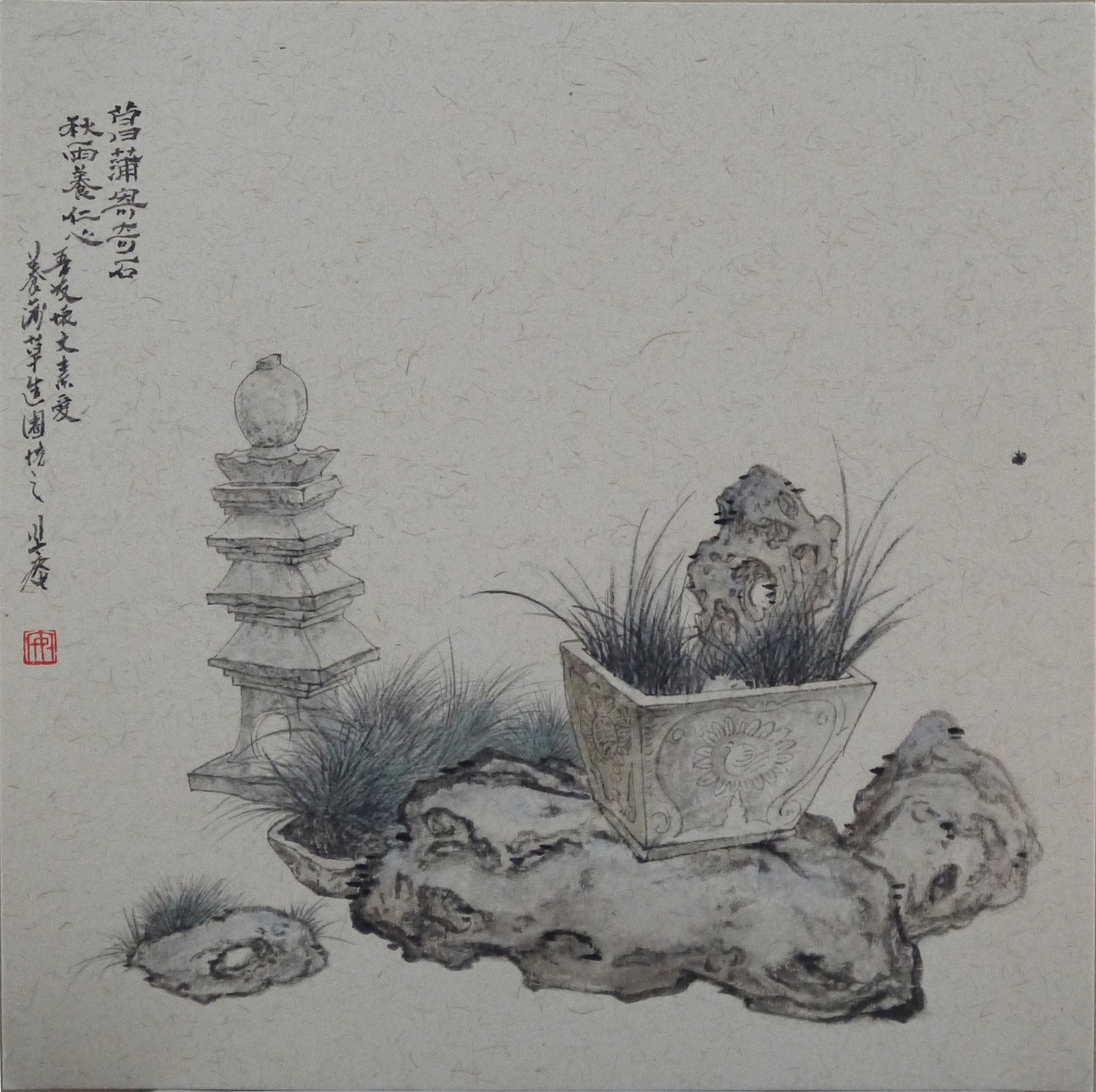 名称:《菖蒲寄奇石 秋雨养仁心》 作者:方安国 尺寸35x35cm 材质:卡纸纸本设色 年份:2021